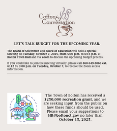 Notice is hereby given to the taxpayers of the Town of Bolton that the taxes for the 2024 Grand List will be due and payable on October 1st, 2025.