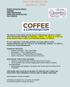 In accordance with the requirements of the CT DEEP General Permit for the Discharge of Stormwater from Small Municipal Separate Storm Sewer Systems, residents of the Town of Bolton are hereby informed that a draft pdf of the 2025 MS4 Stormwater Annual Report, which summarizes municipal stormwater compliance activities conducted within the Town of Bolton during calendar year 2025, will be posted on…