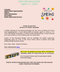 A Public Hearing on the Proposed Budget for the Town of Bolton for Fiscal Year beginning July 1, 2026, will be held on Tuesday, April 21, 2026, at 7:15 P.M. at the Bolton Town Hall, 222 Bolton Center Road, Bolton, CT and via Zoom (see town website at www.boltonct.gov for Zoom info).