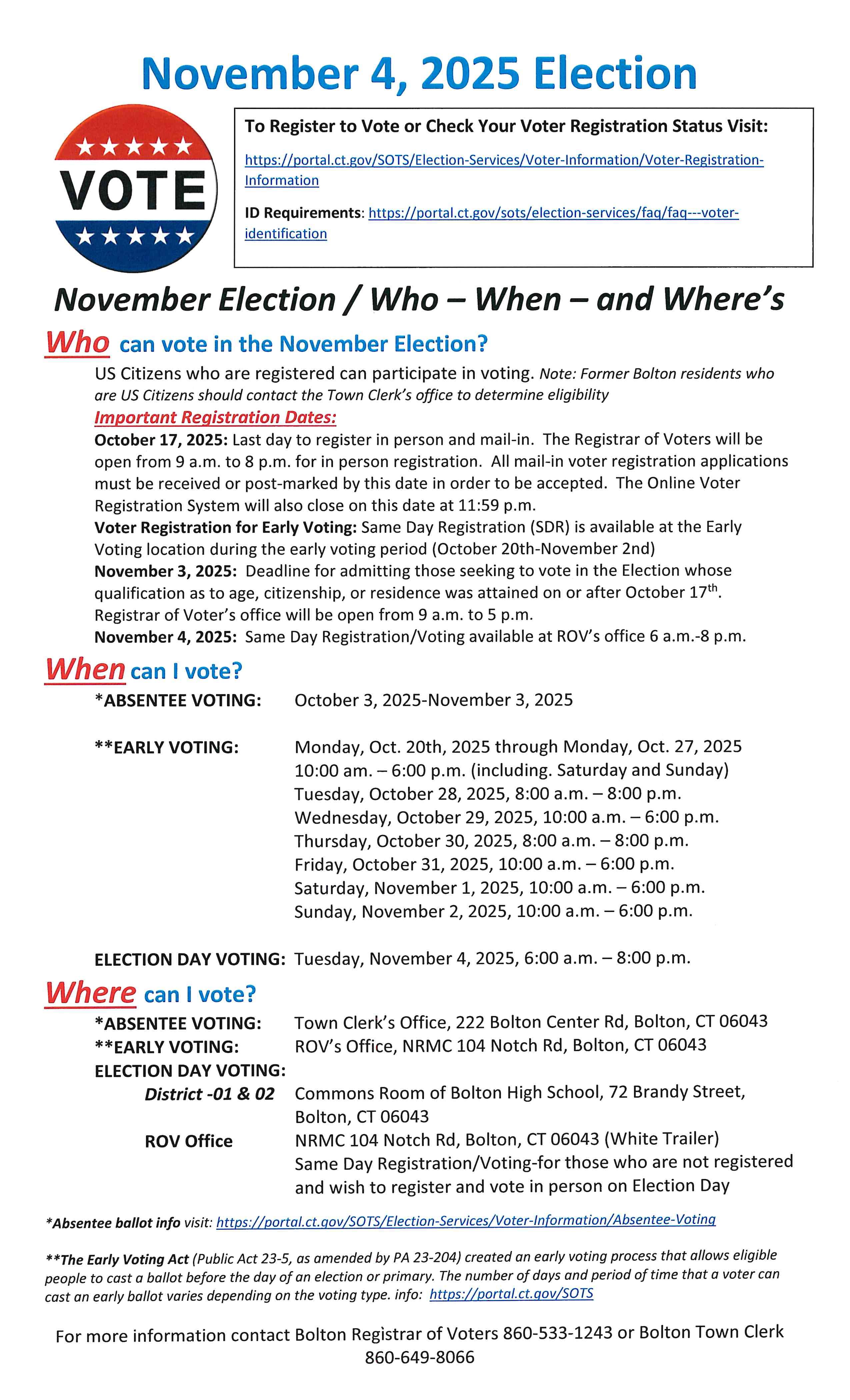 LOCATION: Both Districts - 01 & 02 - Commons Room of Bolton High School, 72 Brandy Street, Bolton, CT 06043